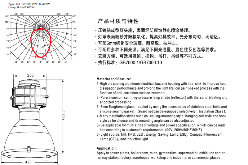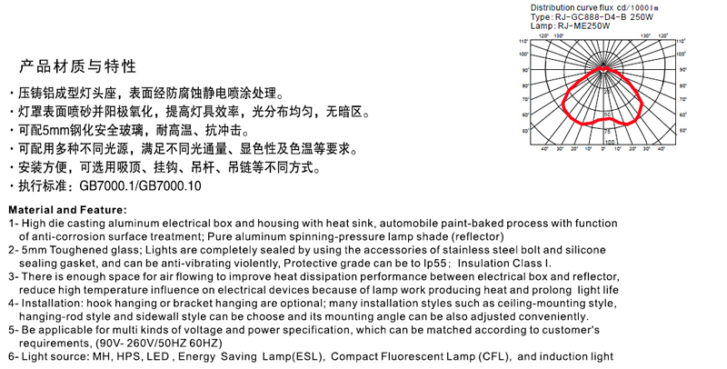 压铸铝成型灯头座,表面经防腐蚀境地昂喷涂处理。灯罩表面喷砂并阳极氧化,提高灯具效率,光分布均匀,无暗区。